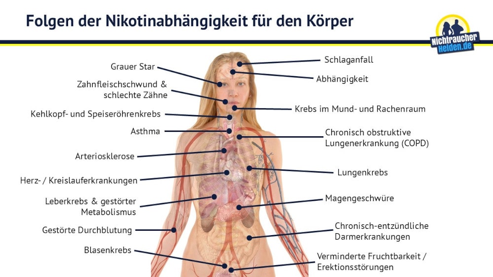 Nikotin wirkt nicht harmlos, es hat zahlreiche negative Folgen für Deine Gesundheit. Zigarettenrauch schädigt nahezu jedes Organ in Deinem Körper! Tabak beziehungsweise Tabakrauch enthält rund 5.000 chemische Substanzen, von denen etwa 90 als potenziell krebserregend gelten. Der Tabakatlas des Deutschen Krebsforschungszentrums und der Deutschen Krebshilfe stellt klar, dass Rauchen fast 20 Prozent aller Krebsneuerkrankungen verursacht. Laut medizinischen Studien haben Raucher zudem im Vergleich zu Nichtrauchern ein mehr als doppelt so hohes Risiko für Herz-Kreislauferkrankungen und ein doppelt so hohes Risiko für Schlaganfälle. Jeder siebte Todesfall in Deutschland ist auf das Rauchen zurückzuführen.